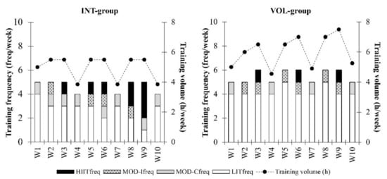 Training period: During the 10-week training period, the participants of the INT- and VOL-groups utilized individually scaled training programs. The aim was to increase progressively training load by either increasing the proportion of moderate and high-intensity sessions or volume of the training. After one easier week, during which the participants were familiarized with the predefined training, it was periodized into three three-week mesocycles of two intensive weeks followed by one recovery week (70% volume of the preceding week, only one moderate-intensity-session). The goal of the INT-group was to progressively increase the proportion of training above the first lactate threshold compared to the average of the control period, while maintaining the total endurance training volume the same. Progression started from one additional session and led to three additional sessions during the intensive training weeks, accounting for 10 sessions in total. Furthermore, the intensity of these sessions progressed from moderate-intensity training towards high-intensity training. The goal of the VOL-group was to progressively increase the volume of low-intensity training compared to the control period from 20% to 50% during intensive weeks while maintaining the volume of moderate and high-intensity training the same. Volume was increased primarily by adding duration to each training session, and weekly training frequency was kept similar. The training progression during the training period is illustrated in Figure 1.
