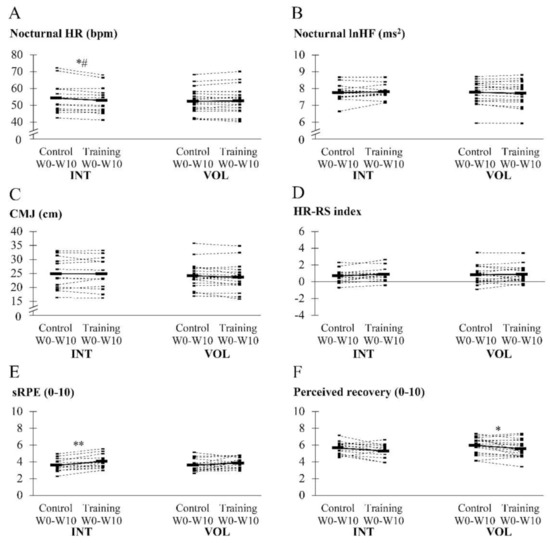 Individual averaged values of the monitoring variables are presented in Figure 2. Significant differences between the control and training periods were observed in the session RPE of INT (p = 0.001, ES = 0.58), perceived recovery of VOL (−6.3 ± 10.1%, p = 0.021, ES = −0.43) and nocturnal heart rate of INT (p = 0.016, ES = −0.14). The relative change of nocturnal heart rate was significantly different between the groups (INT −2.1 ± 2.6% vs. VOL 0.4 ± 2.5%, p = 0.013, ES = −0.99). In addition, perceived recovery tended to decrease in INT (−6.1 ± 11.4%), p = 0.056, ES = −0.45). Small to moderate effect sizes were observed when relative changes were compared between the groups in CMJ (INT 0.0 ± 5.0% vs. VOL −2.3 ± 5.1%, ES = 0.46), lnHF (INT 0.7 ± 2.9% vs. −0.6 ± 1.8%, ES = 0.54), session RPE (INT 13.9 ± 12.4% vs. VOL 8.8 ± 18.4%, ES = 0.32), and in absolute changes of the HR-RS index (INT 0.2 ± 0.4 vs. 0.0 ± 0.5, ES = 0.34).