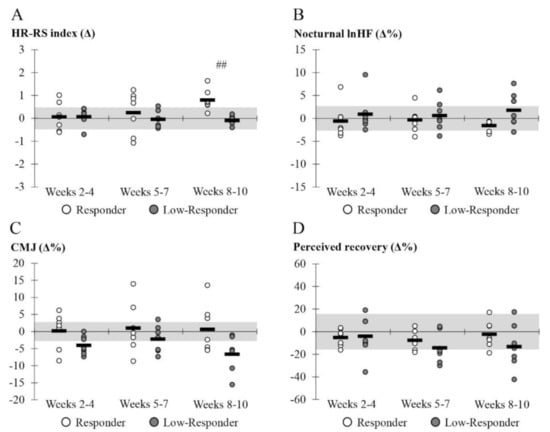 For further analysis, the both groups were combined so that the participants were retrospectively divided into the subgroups of low-responders and responders. When the subgroups were compared across the training period, the only significant difference was observed in the HR-RS index during the last mesocycle (p = 0.005, ES = −0.84). In weeks 8–10, small to moderate between group effect sizes were also observed in lnHF (ES = −0.56), perceived recovery (ES = −0.32), and CMJ (ES = −0.50). Individual values in the relative changes across the training period are presented in Figure 3.