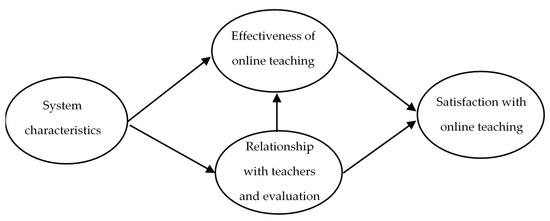 Based on the literature [30,31,32,33,34,35,36,37,38,39,40,41] we specify the structural equation model. On the basis of the above studies, we propose that the system characteristics affect both the effectiveness of the online teaching and the relationship with teachers and evaluation. At the same time, we propose that the effectiveness of online teaching is influenced by the relationship with teachers and evaluation. Finally, we propose that these latent variables influence the satisfaction with online teaching. The importance-performance analysis is an exploratory method and, therefore, we do not define any hypothesis.