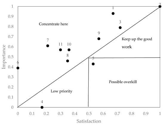 According to the values obtained in Table 9, the IPA representation was performed in Figure 2. To enhance the Martilla and James [27] representation, a combination of classic models was used in opposition to the diagonal models that divide the analysis space in two halves [28,55,56,57]. The diagonal models are based on the calculation of the discrepancies. The attributes with positive discrepancies are those in which importance exceeds satisfaction, thus, they represent a high priority for improvement. The greater the discrepancy, the more urgent the priority to attend to the attribute. In Figure 2, the attributes with a positive discrepancy are situated above the diagonal, in the quadrant named “concentrate on this”, whereas the attributes with negative discrepancies are below the diagonal. In this case, by combining the diagonal models with the classic Martilla and James [27] representation we differentiate three areas in which, based on the values of importance and satisfaction, we identify those attributes that indicate continuing with good work, attributes of low priority and attributes of a potential waste of resources.