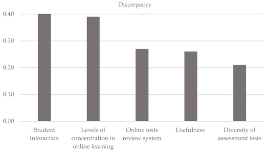 It can be observed that there are eight attributes that fall within the “concentrate on this” area, meaning that these attributes need to be improved. The attributes that require attention are those that are furthest from the diagonal. In this case, the discrepancies show that the attributes most in need of improvement are interaction with other students (attribute 7), levels of concentration in online classes (attribute 6), online tests review system (attribute 11), usefulness of the system (attribute 1) and diversity of activities used in student assessment (attribute 10). There is no attribute in the “continue with the good work” quadrant, while the “low priority” quadrant contains learning speed in online teaching compared to face-to-face teaching (attribute 4). The possible waste of resources quadrant has the online learning autonomy attribute. The results clearly show that there is a general level of dissatisfaction among students with the online teaching rolled out since the outset of COVID-19. Finally, Figure 3 shows the five priority attributes of online teaching that need to be improved.