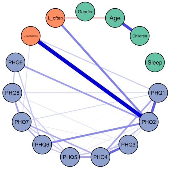 Relationships between PHQ-9 items, demographics and loneliness. Green: demographics; orange: loneliness; blue: PHQ; the edge between L_sometimes and L_often was excluded. L_sometimes = dummy variable encoding loneliness “sometimes” as 1, “never” or “often” as 0; L_often = dummy variable encoding loneliness “often” as 1, “never” or “sometimes” as 0; children = living with children in the same household; sleep = average hours of sleep per night in the previous 7 days; Patient Health Questionnaire (PHQ)-1 = little interest or pleasure in doing things; PHQ-2 = feeling down, depressed, or hopeless; PHQ-3 = trouble falling or staying asleep, or sleeping too much; PHQ-4 = feeling tired or having little energy; PHQ-5 = poor appetite or overeating; PHQ-6 = feeling bad about yourself—or that you are a failure or have let yourself or your family down; PHQ-7 = trouble concentrating on things, such as reading the newspaper or watching television; PHQ-8 = moving or speaking so slowly that other people could have noticed. Or the opposite—being so fidgety or restless that you have been moving around a lot more than usual; PHQ-9 = thoughts that you would be better off dead, or of hurting yourself.