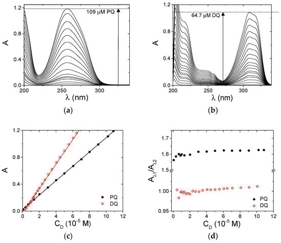 The optical properties of PQ and DQ molecules were characterized under physiological conditions (NaCl 0.1 M, NaCac 2.5 mM, pH 7.0). Absorbance spectra at different concentrations were recorded for both of the herbicides (Figure 2a,b). The unaltered spectral profile (Figure 2a,b) and the linearity of the Lambert and Beer plots (Figure 2c) indicate that the molecules do not aggregate under the explored conditions. The possible presence of aggregates was checked by inspecting absorbance ratio plots which may evidence a more subtle change in the profiles (Figure 2d).