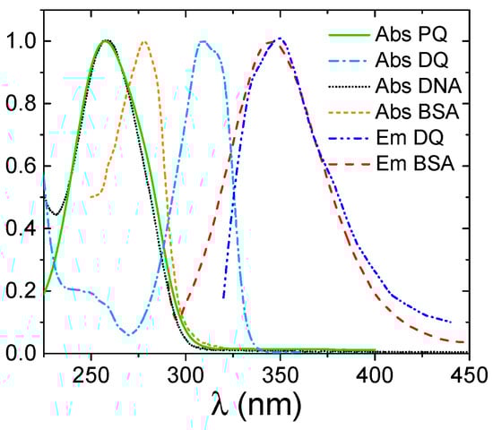 Normalized absorbance (Abs) and emission (Em) profiles of PQ, DQ and the biotargets.