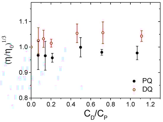 The same conclusion emerges from the viscosity measurements carried out for the two herbicide/DNA systems at different herbicide/DNA (CD/CP) ratios. The flow times (t) were used to calculate the relative viscosity according to Equation (1). For both herbicides, the relative viscosity remained almost constant upon the addition of increasing amounts of herbicide (Figure 4), indicating no significant elongation of the DNA helix. This result underlines the absence of intercalation between the DNA base pairs for both PQ and DQ.