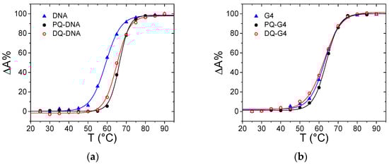 Melting curves for (a) ct-DNA (triangle), PQ/DNA (full circle) and DQ/DNA (open circle), CDNA = 1.14 × 10−5 M, CPQ = 1.14 × 10−5 M, CDQ = 1.06 × 10−5 M, NaCac 2.5 mM, pH 7.0, 260 nm; (b) G-quadruplex tel23 (G4, triangle), PQ/G4 (full circle) and DQG4 (open circle), CG4 = 5.51 × 10−6 M, CPQ = 6.01 × 10−6 M, CDQ = 5.47 × 10−6 M, KCl 0.1 M, LiCac 2.5 mM, pH 7.0, 295 nm.