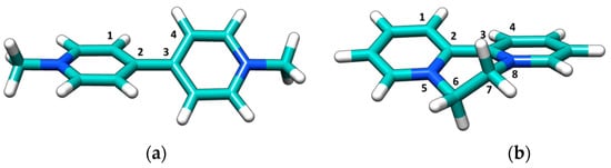 Among the copious classes of pesticides, bipyridyl herbicides deserve high interest due to their widespread application: they are quaternary ammonium compounds (also known as “quats”) marketed as contact herbicides and desiccants []. The paraquat (PQ) and diquat (DQ) molecules that are the focus of the current study (Figure 1) are major components of this family, and both show significant toxicity [,,].