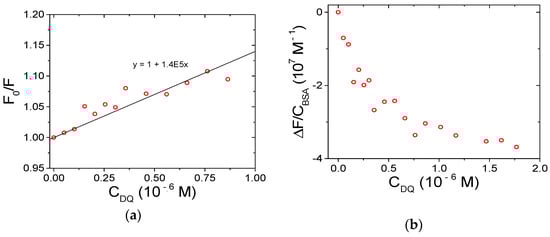 Spectrofluorimetric titration for the DQ/BSA system: (a) Stern–Volmer plot; (b) binding isotherm; CBSA = 1.50 × 10−6 M, NaCl 0.1 M, NaCac 2.5 mM, pH 7.0, 37.0 °C, λex = 295 nm, λem = 345 nm.
