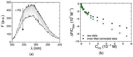 Differently, in the case of PQ, the spectrofluorometric titrations could be carried out under more favorable conditions that enabled analysis of the details of the interaction with BSA. Note that inner filter effects still affected the measurements: we carefully optimized the experiments and corrected the signals according to: