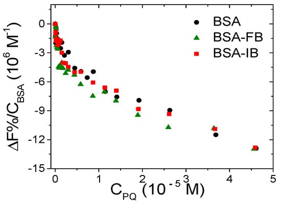 where F0/F corresponds to the ratio between the BSA fluorescence intensity in the absence and the presence of the quencher (PQ), respectively, KSV represents the Stern–Volmer constant, [Q] is the molar concentration of the quencher, kq is the bimolecular quenching constant, and τ0 corresponds to the average lifetime of the protein in the absence of quencher. Note that the F values must be corrected for dilution and inner filter before use. For static quenching, KSV will be equal to the binding constant for complex formation (if the complex is non-fluorescent). Note that [Q] corresponds to [Qfree] (the molar concentration of free quencher). Therefore, just the points under quencher excess ([Qfree] ≅ Qtot) were considered in the data analysis. KSV is equal to (6.5 ± 0.8) × 103 M−1 at 25.0 °C. Because τ0 = 7 ns for protein BSA [], kq results are beyond the upper limit for collisional quenching (kq = 3 × 1010 M−1 s−1) and should be necessarily related to the presence of some non-collisional quenching (complex formation) []. Moreover, the lack of dependence on temperature (Figure 9a) also confirms the non-collisional nature of the quenching process.