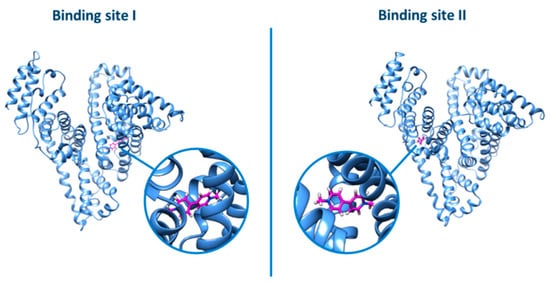 The same picture was also evidenced by the docking analysis (Figure 11): no relevant difference was observed by docking the ligand into the two different binding sites (grid score for binding site I = −26.16; grid score for binding site II = −26.46).