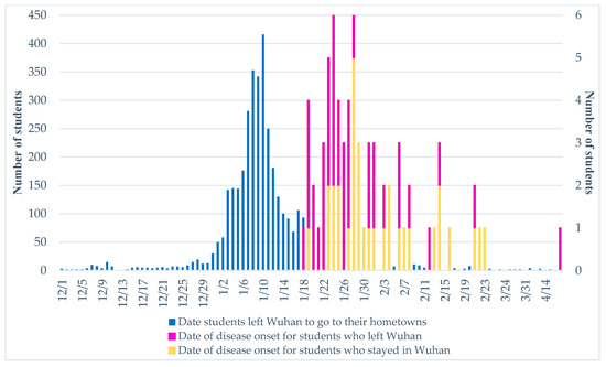 Epidemiological curves for the date students left Wuhan to go to their hometowns and the date of disease onset.