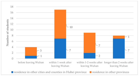 Figure 2 shows the gap between the time of departure from Wuhan to the time of disease onset in students. For the 38 infected students who left Wuhan, the date of disease onset was before the date of departure from Wuhan for four infected students, the date of disease onset was within 1 week after leaving Wuhan for 17 infected students (the highest number, 44.74%), and the date of disease onset was within 1–2 weeks after leaving Wuhan for 9 infected students (23.68%). In addition, for eight infected students (21.05%), the date of disease onset was over 2 weeks after leaving Wuhan, and among them, seven students lived in other cities and counties in Hubei Province, where the pandemic was also serious.