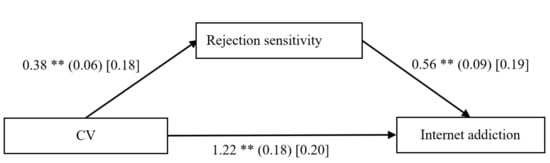 Mediation model of rejection sensitivity between cybervictimization and Internet addiction. Note: CV = cybervictimization. The values outside the brackets are unstandardized coefficients, those in parentheses are standard errors, and those in brackets are standardized coefficients. Paths between gender, age, impulsivity, and each of the variables in the model are not displayed. Of those paths, the following were significant: gender (b = −0.18, SE = 0.02, β = −0.41, t = −7.06, p < 0.01, 95% CI [−0.22, −0.13]), and impulsivity (b = 0.29, SE = 0.03, β = 0.27, t = 9.29, p < 0.01, 95% CI [0.23, 0.36]) to rejection sensitivity; gender (b = 0.26, SE = 0.07, β = 0.21, t = 3.60, p < 0.01, 95% CI [0.12, 0.40]), and impulsivity (b = 0.79, SE = 0.09, β = 0.25, t = 8.49, p < 0.01, 95% CI [0.61, 0.98]) to Internet addiction. ** p < 0.01.
