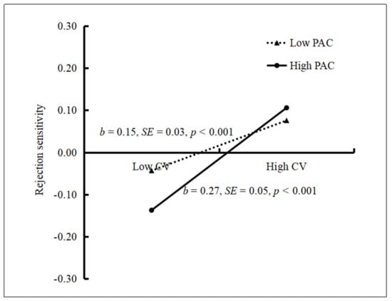 Rejection sensitivity among adolescents as a function of cybervictimization and parent–adolescent communication. Note: CV = cybervictimization, PAC = parent–adolescent communication.