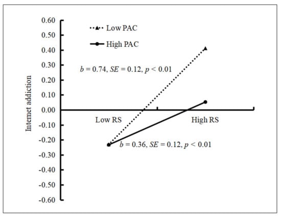 Additionally, we find that parent–adolescent communication moderates the association between rejection sensitivity and Internet addiction. Adolescents with high parent–adolescent communication showed better adaptability in the face of stronger rejection sensitivity. Positive parent–adolescent communication makes adolescents who have experienced bullying feel supported, understood, and loved, and increases parents’ objective understanding of adolescents’ situations. This gradually develops adolescents’ ability to solve problems independently, which is beneficial for promoting their self-esteem and self-protection [,]. Thus, adolescents sharing a close relationship with their parents tends to compensate for their social deficits by communicating with them, instead of using the Internet, after experiencing interpersonal stressors. Additionally, rejection sensitivity may cause adolescents to be scared to share their true feelings, due to the fear that they will not be recognized and accepted. To avoid further deterioration of interpersonal relationships, adolescents might choose the Internet to channel their anxiety. However, strong parent–adolescent communication can improve adolescents’ understanding of their immediate emotional reactions and allow them to recognize their emotions, rather than relying on the Internet alone, which will help improve their adaptability.