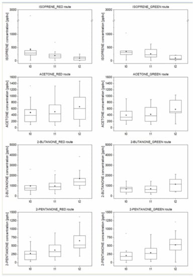 - King, J.; Kupferthaler, A.; Unterkofler, K.; Koc, H.; Teschl, S.; Teschl, G.; Miekisch, W.; Schubert, J.; Hinterhuber, H.; Amann, A. Isoprene and acetone concentration profiles during exercise on an ergometer. J. Breath Res. 2009, 3, 027006. [Google Scholar] [CrossRef]