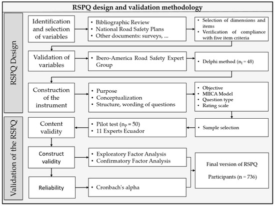 Before applying the RSPQ, a content validation process should be carried out, as previous studies have done [68,69,70]. For content evaluation, a pilot sample of 50 drivers and 11 Ecuadorian experts is used, as recommended by Hurtado and Tangarife [65,71] The construct validity is performed through Exploratory Factor Analysis and Confirmatory Factor Analysis and finally, the Reliability is performed with Cronbach’s Alpha but with a sample of 736 drivers. The process of validating the questionnaire is described below.