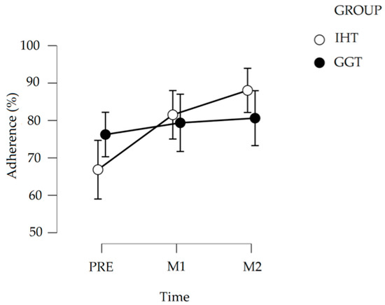 As shown in Figure 1 and Table 2, adherence before lockdown (PRE) did not differ between the two groups. On the other hand, as shown in Table 3, IHT adherence showed a statistically significant progressive increase from PRE (66.8 ± 37.6%) to M1 (81.5 ± 31.0%) and to M2 (88.0 ± 28.3%). Conversely, in the GGT group, adherence did not statistically change from PRE (76.3 ± 26.6%) to M1 (79.4 ± 34.2%) and M2 (80.6 ± 32.8%).