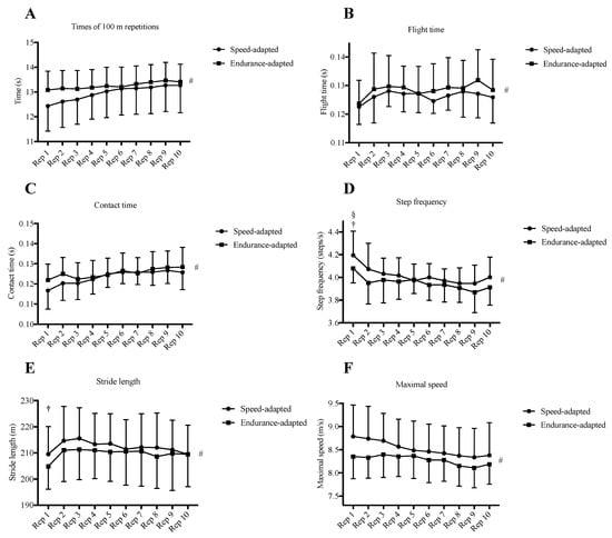 Mean (± SD) repetitions time (A), flight time (B), contact time (C), step frequency (D), stride length (E), and maximal speed of each repetition (F). † and § indicate the differences between successive repetitions (p < 0.05, d ≥ 0.61) in speed- and endurance-adapted milers, respectively. # indicates main time effect.