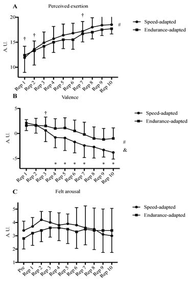 Mean (± SD) ratings of perceived exertion (A), valence (B) and felt arousal (C). † indicates the differences between successive repetitions (p < 0.05, d ≥ 0.61) in speed-adapted milers. * indicates the differences between groups after each repetition. # and & indicates main time and group effect, respectively.