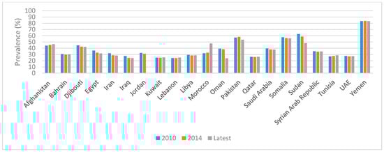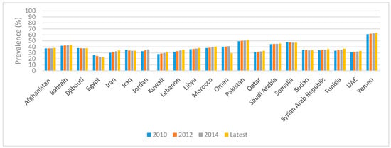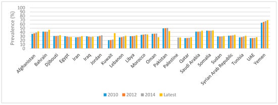 Trends in the prevalence of anemia amongst WRA (15–49 years) in countries of the EMR. References: 2010, 2012, and 2014 data were based on the WHO GHO Database [27]. The latest data were based on the WHO GHO Data Repository–Prevalence of anemia in women (2016) [27] and on the WHO EMRO Monitoring health and health system performance in the Eastern Mediterranean Region, Core indicators and indicators on the health-related Sustainable Development Goals 2019 [30], with the following exceptions: the data for Morocco were based on the recent Moroccan NNS 2019–2020 [37]. The data for Oman were based on the recent Oman NNS in 2017 [36]. The data pertinent to Pakistan were based on the recent NNS 2018 [32]. Anemia was defined as an Hb concentration < 120 g/L, adjusted for altitude and smoking. Abbreviations: EMR: Eastern Mediterranean Region; EMRO: Regional Office for the Eastern Mediterranean; GHO: Global Health Observatory; Hb: hemoglobin; NNS: National Nutrition Survey; UAE: United Arab Emirates; WHO: World Health Organization; WRA: women of reproductive age.