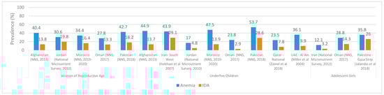 The relative contribution of IDA to anemia in the EMR was assessed based on national surveys or studies that have reported on both indicators on the same population. Overall, data on IDA were not systematically available for EMR countries. Given the high cost and complexity of blood collection, treatment, transportation, storage, and analyses, few countries have collected data on the population’s SF levels, which are used to assess the proportion of anemia that is due to iron deficiency [2,41]. Available evidence suggests that the prevalence of IDA is considerably lower than that of anemia (Figure 4). For instance, in Afghanistan, the NNS estimated the prevalence of IDA at 13.8% in WRA, while that of anemia was three times higher (40.4%) [33]. Similar observations were reported from Jordan, Morocco, Oman, and Pakistan [32,36,37,42] (Figure 4). National studies conducted amongst WRA in Iraq, Jordan, and Lebanon estimated the prevalence of IDA at 4.9%, 19.8%, and 13.4%, respectively [42,43,44]. Amongst PW, available data on IDA is very limited. In Kuwait, it was reported that IDA represented approximately 60% of overall anemia cases in PW, the latter being estimated at 41.3% [45]. A study conducted in rural districts of Egypt reported a prevalence of 51.3% of IDA amongst PW [46]. In Iran, the prevalence of anemia and IDA amongst PW was estimated at 14% and 0.6 %, respectively [34].