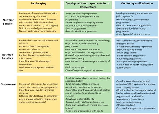 The review of evidence undertaken in this paper showed that anemia reduction interventions are fragmented, and none of the EMR countries have a comprehensive anemia reduction strategy. Acknowledging that the control of anemia is crucial for the prevention of ill health amongst women, children, and future generations, the Strategy on Nutrition for the EMR 2020–2030 has called for action to reduce the burden of anemia in countries of the region [24]. In this context, it is crucial that countries of the EMR revisit their national anemia reduction activities by adopting holistic and comprehensive approaches that consider all domains and procedures that may have a role in alleviating anemia [2]. Policymakers seeking to reduce the prevalence of anemia in countries of the region will not achieve the desired outcomes without first understanding the local context and intervening through a broad range of pertinent interventions that address this complexity [2,142]. This can be done by undertaking local landscape analyses to identify the key drivers of anemia, understanding which anemia-related programs are working in the country and which are likely bottlenecks, and delineate opportunities for multisectoral support and engagement. Landscape analyses can be used to inform decisions and develop context-specific interventions (Figure 5) [2,156].