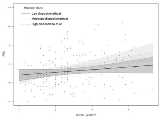 An additional and innovative result of the present study is the partially moderating role of dispositional trust in the relationship between social anxiety and PSU as well as smartphone use and PSU. More precisely, our results suggest that those who spent more time on the device and trusted others more showed higher levels of PSU. Young individuals with high levels of trust have been found to be less adapted in their social context, compared to people with intermediate levels of trust [111,112,113]. Highly trusting in others has also been described as having its “dark side” [114], because some trust experiences may result in an unwelcome burden due to less-than-benign intent in the people involved. In general, individuals with high levels of dispositional trust have been described as more prone to look for online interactions, initiate smartphone-based communications [75], and invest their time in the online social context [61,74]. As more and more connections are initiated and maintained through social media, or via smartphone-mediated communication in general, this predisposition may strengthen PSU. This is particularly true for socially anxious individuals who tend to avoid face-to-face interactions [106], and for those particularly attached to their smartphones in terms of usage and time engaging in smartphone activities.