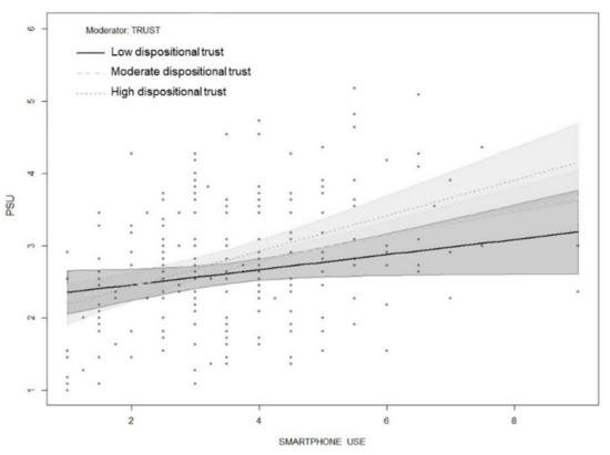 Finally, we hypothesized that dispositional trust moderates the relationship between social anxiety, smartphone use, and PSU. Evaluation of the interaction terms revealed that dispositional trust did not moderate the relationship between social anxiety and smartphone use. However, dispositional trust moderated the direct relationships between social anxiety and PSU as well as smartphone use and PSU. Specifically, the conditional direct effect of social anxiety on PSU was positive and significant at moderate (B = 0.261, p < 0.001) and high (B = 0.418, p < 0.001) levels of dispositional trust, where moderate and high were at the 50th and 84th percentiles of the dispositional trust mean-centered distribution, respectively. Similarly, the direct conditional effect of smartphone use on PSU was positive and significant at moderate (B = 0.166, p < 0.001) and high (B = 0.258, p < 0.001) levels of dispositional trust. These results partially supported H4. The overall moderated mediation model explained 22% of the variance in PSU. In order to visualize the conditional effect of three levels of dispositional trust (low, moderate, high) on the relationship between social anxiety and PSU as well as smartphone use and PSU, the interaction effects are shown in Figure 3 and Figure 4.