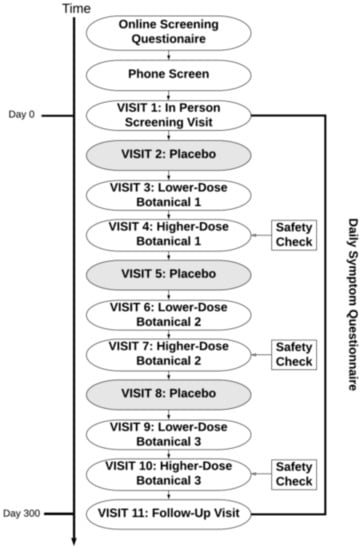 Study protocol. Each participant completed testing of up to three botanicals. Some participants opted to re-enroll in the study protocol after completion, resulting in a maximum of six botanical assignments. For each botanical, there was a placebo condition, followed by lower-dose botanical and higher-dose botanical conditions. The period of time between visits was 30 +/− 3 days.