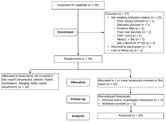 Exclusionary criteria included current opioid, daily anti-inflammatory, nitroglycerine, or lithium medication use; history of anaphylaxis to study botanical compounds; presence of severe depressive symptoms as indicated by a Hospital Anxiety and Depression Scale (HADS [37]) depression subscale score ≥16; presence of a blood or clotting disorder; hypotension (under 90/60 mmHg) or history of cardiovascular disease; diagnosed rheumatologic or autoimmune disease; and acute infection (body temperature over 100.4 °F). Baseline laboratory values of erythrocyte sedimentation rate (ESR) > 40 mmHr, positive rheumatoid factor (RF), CRP > 10.0 mg/L, or positive antinuclear antibody (ANA) were also exclusionary. Participants could also not have current Posttraumatic Stress Disorder (PTSD). PTSD was initially screened with the PTSD Checklist—Military Version (PCL-M [38]), and individuals with PCL-M scores ≥50 were given the Clinician Administered PTSD Scale (CAPS-5 [39]) for a final determination.