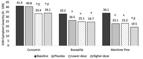 Main treatment effects of curcumin, boswellia, and maritime pine on Gulf War Illness (GWI) symptom severity. Average symptom levels (0–100) are presented for the baseline, placebo, lower-dose, and higher-dose conditions. * significantly lower than baseline (p < 0.05). *# significantly lower than baseline and placebo (p < 0.05).