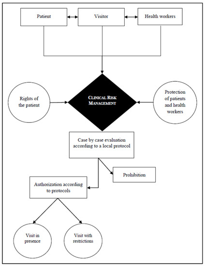 The dignity, affectivity and interactions of patients affected by COVID-19 are guaranteed even in end-of-life situations; this assumes even greater importance in hospices, considering the nature of such facilities [55,56,57]. Therefore, training must be provided for care workers to acquire the specific expertise needed to facilitate the various forms of remote communication between admitted patients and their family members, mindful that clinical updates may concern deteriorating or dramatic situations in the absence of the therapeutic benefits that the proxemic aspect of face-to-face interactions provides [58]. Figure 1 (“Steps for prevention and intervention in managing visitation in nursing homes”) shows that clinical risk management is the focal point for action plans devised by healthcare facility administrations to mitigate infectious risks within nursing homes. This enables them to care for patient needs, their right to interact with others but also the need for protection.