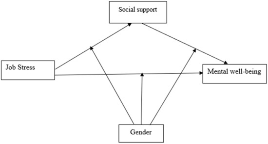 The mediation hypothesis suggest that social support may mediate the relationship between job stress and mental well-being outcomes [36,37,38]. For example, a cross-sectional study conducted among young Chinese nurses in 16 tertiary hospitals in Chengdu found evidence that suggest that social support mediates the relationship between job stress and negative mental well-being such as depression, anxiety, and job burnout [36]. Similarly, a study conducted by Wu and colleagues [37] among 1464 banking staff in China concluded that the relationship between job stress and cynicism is mediated through social support. Contrarily, a systematic review analysis of Viswesvaran et al. [38] on relevant studies did not find evidence that social support may mediate the relationship between job stress and mental well-being. Thus, findings from the mediational hypothesis have been inconsistent. Meanwhile, little is known whether the mediating role of social support in the relationship between job stress and mental well-being among working adults may vary with gender, as no attention has been focused on this question.