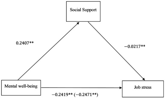 According to the mediational effect or model, job stress may have a direct effect on social support, and social support may in turn predict mental well-being. For instance, some scholars have argued that there is an inverse relationship between stress and social support, and that those who have lower levels of job stress, perceive their social support to be high [37]. Meanwhile, numerous studies have also suggested that social support is an important factor in maintaining good physical and psychological health [33,39,40]. More importantly, higher levels of social support may serve as a protective factor against negative mental well-being such as depression, anxiety, poor life satisfaction, and poor quality of life [36].