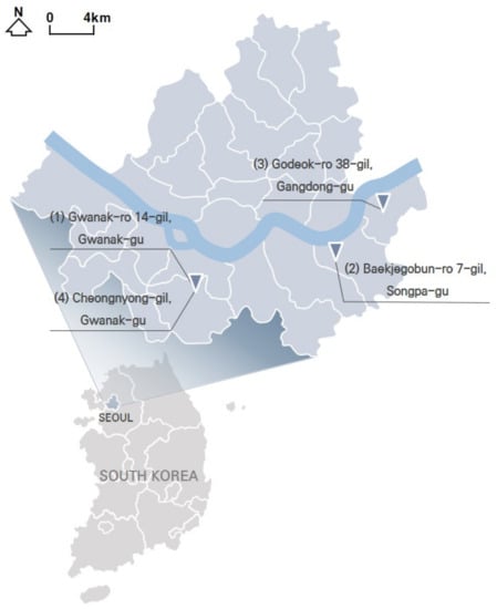 Seoul, South Korea is no exception to this problem. Its traditional urban tissue includes many narrow streets without sidewalks, named i-myeon-do-ro (literally “back road”). In terms of total length, i-myeon-do-ro less than 12 m wide (hereafter, just “back roads”) comprise about 76.8% of the streets in Seoul by length [], and about 66.9% of pedestrian traffic accidents occurred on these streets in Korea []. It is hard to be sure that installing narrow sidewalks on these roads is an optimal alternative for pedestrians. Due to the characteristics of back roads, which are used for direct access to buildings, pedestrians use these roads frequently. If pedestrians and vehicles are completely separated by narrow sidewalks, dangerous situations could occur when pedestrians are driven out of the sidewalk. Otherwise, they must endure the limited space and inconvenience of walking.