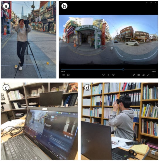 Omnidirectional video recording and experiment setting. (a) omnidirectional camera setting; (b) an example of edited 360-degree video (captured image); (c) real-time monitoring screen of the survey using HMD; (d) actual VR experiment scene.
