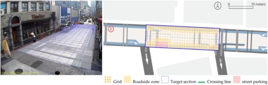 To quantitatively measure the degree of free walking in PPSs, we applied the tracing method. Gehl regarded this approach as an efficient behavior observation and analysis technique [] (p. 28). We tracked and digitized the walking paths of all pedestrians (a total of 305) appearing in the extracted video clips. For efficient and accurate analysis, a grid network of 1 m × 1 m cells was projected onto the video screen (Figure 3). Interrupted walking, such as entering a nearby building or boarding a vehicle, was excluded from the analysis. When several pedestrians moved in a group, only one path was created based on the midpoint of the group. Finally, we digitized 273 paths. Due to the characteristics of shared space, the pedestrian paths were greatly influenced by not only driving vehicles but also parked vehicles. Hence, the trace mapping results were presented by dividing the time slot according to the presence or absence of parked vehicles.