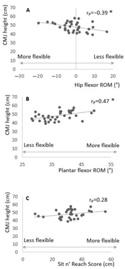 Correlation of countermovement jump (CMJ) height with hip flexor range of motion (RoM) (A), plantar flexor RoM (B), and Sit n’ Reach® score (C). * = indicates a significant correlation.
