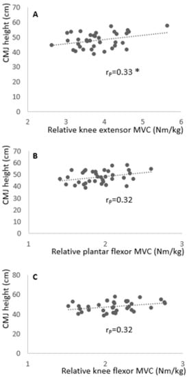 Correlation of CMJ height with relative knee extensor maximum voluntary contraction (MVC) (A), relative plantar flexor MVC (B), and relative knee flexor MVC (C). * = indicates a significant correlation.