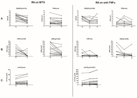 - Iannone, F.; Tampoia, M.; Giannini, M.; Lopalco, G.; Cantarini, L.; Villalta, C.D.; Galeazzi, M.; Lapadula, G. Changes in anti-cyclic citrullinated peptide antibodies and rheumatoid factor isotypes serum levels in patients with rheumatoid arthritis following treatment with different biological drugs. Clin. Exp. Rheumatol. 2017, 34, 424–429. [Google Scholar]