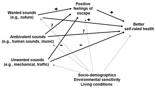 To our knowledge, the current study was the first to explore health effects of various forms of perceived sounds while people were forced to spend unprecedented amount of time in their homes. We also tested for the first time indirect pathways linking soundscape to health in residential environments through feelings of “being away”, one important component of a person’s environmental restorative quality at home. We collected data on both exposure frequency and pleasantness. This allowed us to explore the underpinning dimensionality of sound preference, which guided the differentiation between wanted and unwanted soundscape components. Finally, we accounted for multiple contextual (i.e., income and housing characteristic) and individual factors (i.e., environmental sensitivity and mental health), which could have confounded or modified the effects of soundscape on self-rated health.