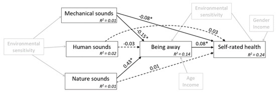 Structural equation model showing the estimated paths linking perceived sounds to feelings of “being away” and self-rated health. Note: Unstandardized regression weights with their significance level are given for each path. R2 shows proportion of variance explained in endogenous variables. Coefficients marked with an asterisk (*) are statistically significant at p < 0.05. Control variables are shown in grey. Covariances, associations between control variables, and errors terms are not displayed to enhance readability.