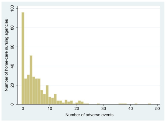 The World Health Organization (WHO) defines an AE as “a harmful incident or an incident that results in harm to a patient” [20]. However, the definition of AE in home-care settings varies across studies [2,3,4,7,8,21]. In this study, we used an original instrumental definition of AE in accordance with the WHO definition, previous studies, and experts’ opinions in accordance with the actual situation of Japanese home-care nursing services. An AE was defined as an event that results in unintended harm to the patient, occurring during service delivery, including any level of severity. AEs consisted of falling down, aspiration, medication error, device-related error, tube-related error, pressure ulcers, catheter related infections, and urinary tract infections (UTI). In the questionnaire, we asked the number of each type of AE that was detected during a three-month period in each agency (January 2020–March 2020). As mentioned above, there is no standardized reporting system regarding AEs. The nursing administrators of the agencies answered AE numbers and type every month (January 2020, February 2020, and March 2020) based on their own reporting system.