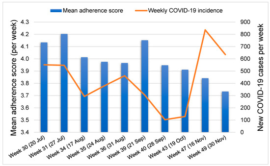 Considering only study weeks with more than 100 responses, the mean weekly adherence score during week n was not significantly associated with the COVID-19 incidence during week n + 1 (Pearson correlation coefficient = 0.166, p = 0.647). A graphical illustration of the evolution of the COVID-19 burden and adherence scores by week is shown in Figure 1.