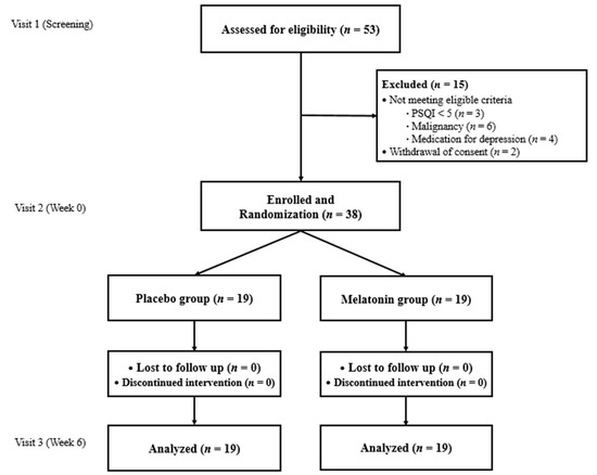 The intended sample of 40 recruited subjects (20 melatonin and 20 placebo) provided a power of approximately 80%, assuming a significance level of <0.05 between the melatonin and placebo groups. The dropout rate was expected to be less than 10% based on the good tolerability of pharmaceuticals. Ultimately, 38 subjects were enrolled. We used nonparametric statistical analysis because of enrollment numbers. Data are presented as median (interquartile range (IQR)) or number (percentage). Wilcoxon signed-rank test was used to compare intragroup differences before and after intervention.