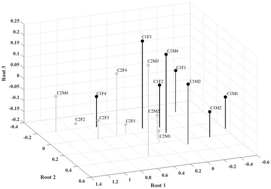 Centroids representation on first, second, and third discriminant functions. Note: Country: C1 and C2. Gender: M, F. Age groups: 1—emerging adults 18–25 years, 2—young adults 26–39 years, 3—middle-aged adults 40–59 years, and 4—elderly of 60 years and more.