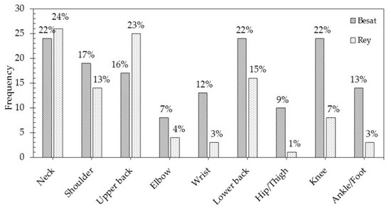 Analysis of the self-reported pain data revealed that employees at the Besat plant experienced the highest level of pain in the neck, lower back, and knee (22%), and employees at the Rey plant experienced the highest level of pain in the neck (23.6%), as depicted in Figure 2.